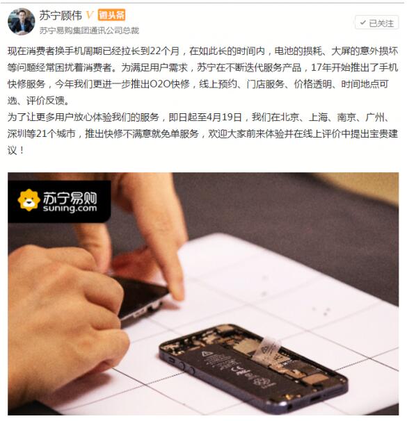 3月20日,针对手机售后市场,苏宁易购副总裁顾伟通过微头条放话:“即日起至4月19日,在北京、上海、南京、广州、深圳等21个核心城市,推出手机快修不满意就免单服务”。不满意就免单,可以说为目前的手机售后市场定下了服务标准。
