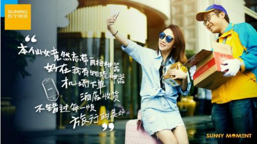 当然,出现在海报上的苏宁物流服务还不止这些。在一副海报上,一个年轻姑娘正拿着手机自拍,一旁是刚刚给她送完货的苏宁物流快递小哥。海报上写着:“本仙女竟然忘带自拍神器,好在我有物流神器,机场下单,酒店收货,不错过每一顿旅行的美好”。这其实也是源自一个真实案例。