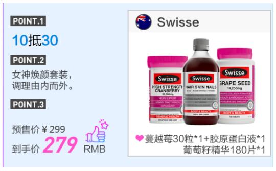 品牌直采,葡萄籽中的原花青素,具有去自由基的作用,口服胶原蛋白能促进皮肤弹性,祛除皱纹,还能促进发质和指甲的生长,呵护女性健康。目前,苏宁海外购预售价299元,现在支付定金10元抵30元,到手价279元。