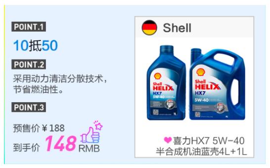 采用动力清洁分散技术,节省燃油性。目前,苏宁海外购预售价188元,现在支付定金10元抵50元,到手价148元。