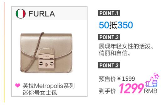这是一款凭简洁线条和巧妙的色彩,表现女士年轻活泼、俏丽和自信的包包。目前,苏宁海外购预售价1599元,现在支付定金50元抵350元,到手价1299元。