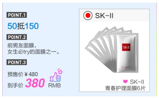 这可是传说中的前男友面膜,超级爆款。能均匀肤色,敷完之后皮肤明显变好了,特别嫩,保湿效果很明显,第二天化妆不会卡粉。目前,苏宁海外购预售价480元,现在支付定金50元抵150元,到手价只要380元。