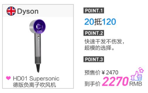 快速造型,干发不伤发,戴森吹风机的大名可谓是响当当。目前,苏宁海外购预售价2490元,现在支付定金20元可抵120元,到手价只要2270元。连超模都在用,你还犹豫什么呢?