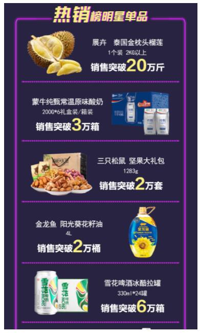 同时,蒙牛纯甄常温原味酸奶、三只松鼠坚果大礼包、金龙鱼阳光葵花籽油、蓝月亮洗衣液等也成为当日前9小时的畅销榜明星单品。