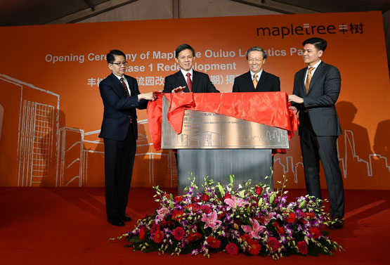 丰树欧罗物流园(一期),即丰树物流信托首个在中国的改建项目,由新加坡贸工部长陈振声先生(左二)、新加坡驻华大使罗家良先生(左一)、丰树物流信托主席李崇贵先生(右二)和丰树中国区物流开发首席执行官李沃文先生(右一)共同揭幕。