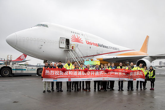 2019年1月15日当地时间11点,友和道通航空和luxaircargo在卢森堡机场共同举办了“武汉=卢森堡”定期货运航线的首航剪彩仪式。卢森堡政府交通部、卢森堡民航局、卢森堡海关、卢森堡机场、卢森堡警察局官员、luxaircargo集团总裁和副总经理、卢森堡两大卡车公司Arthur Welter总裁和Wallenborn总裁均到场表示了热烈的祝贺。